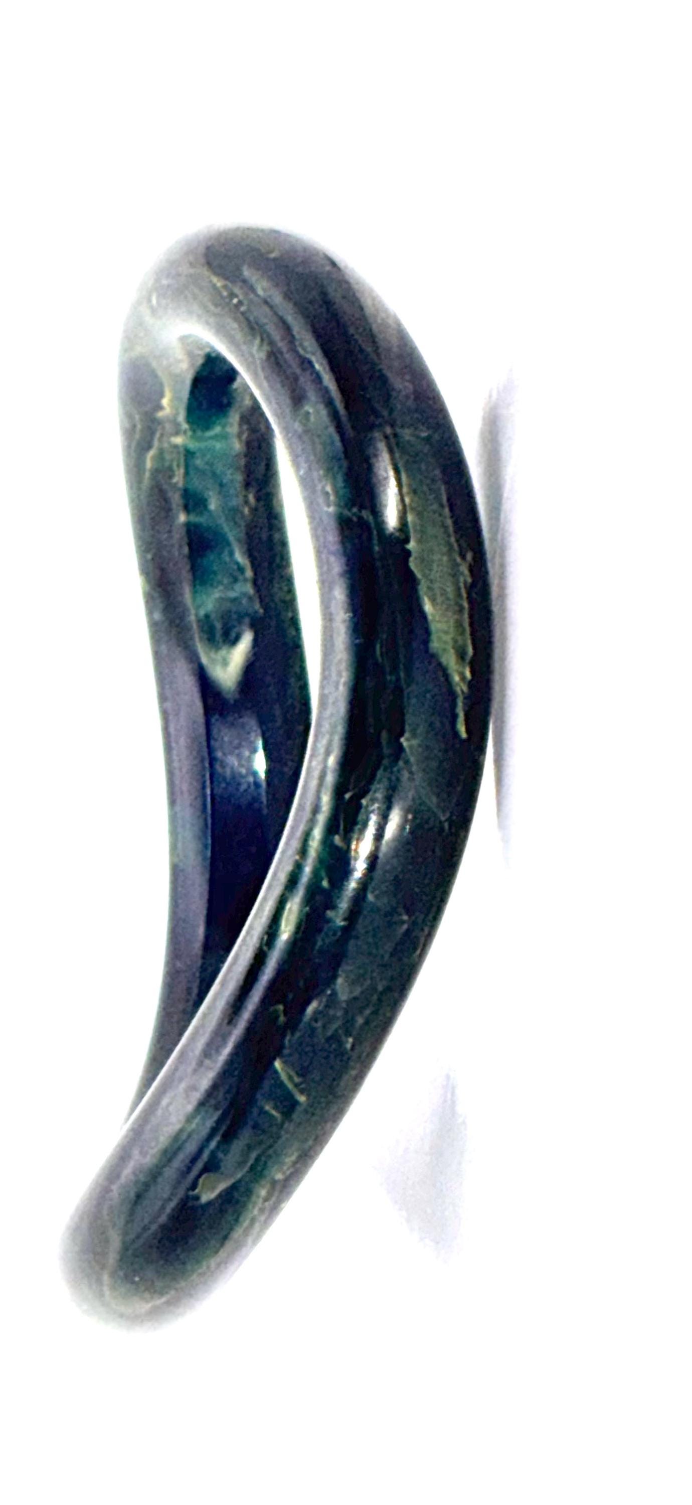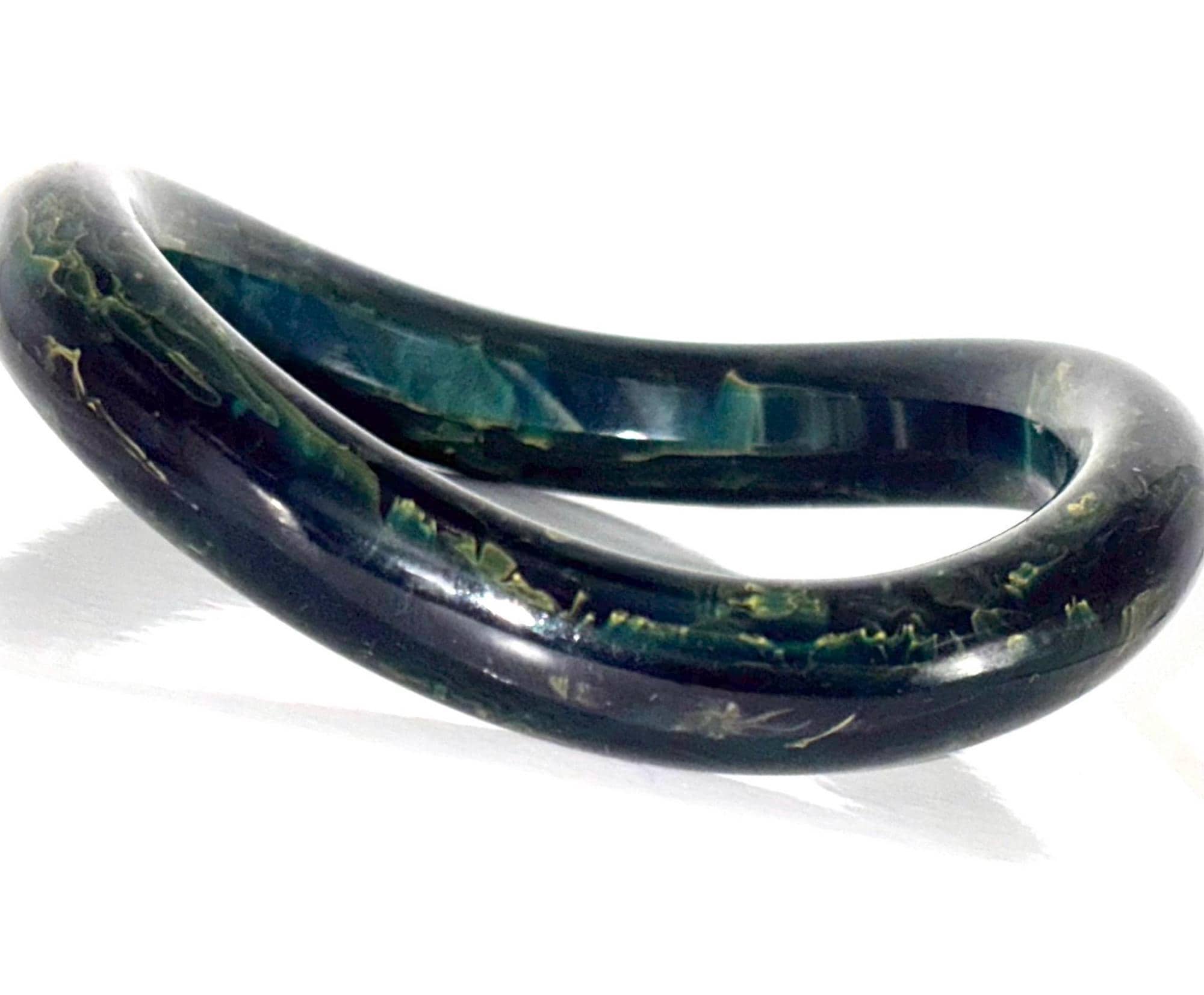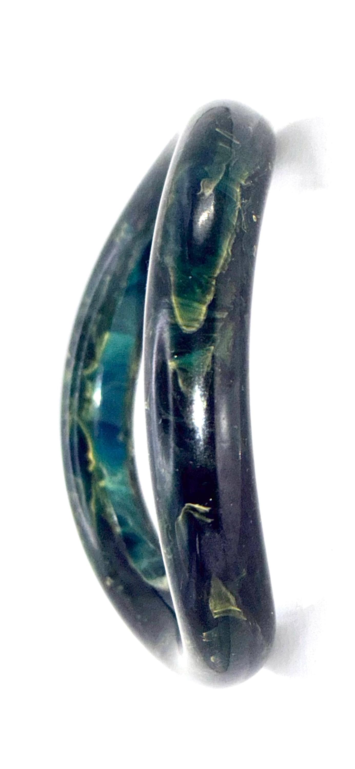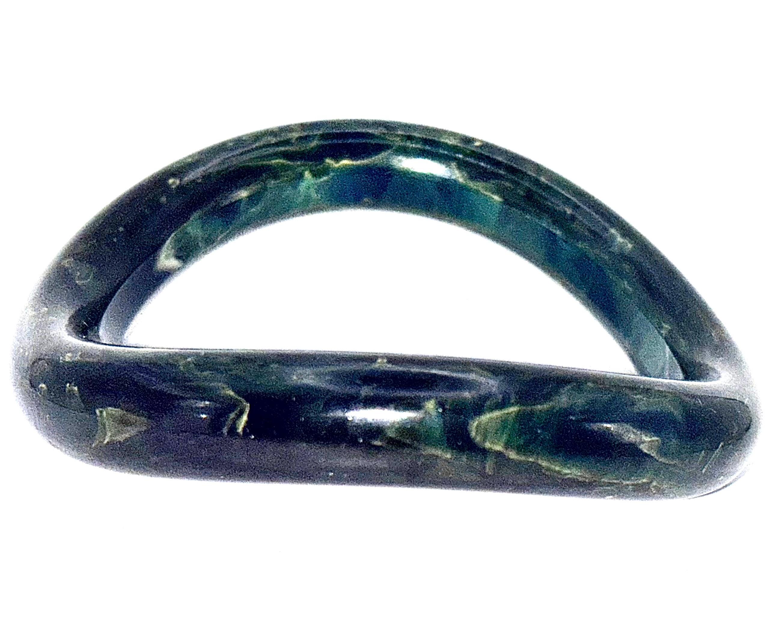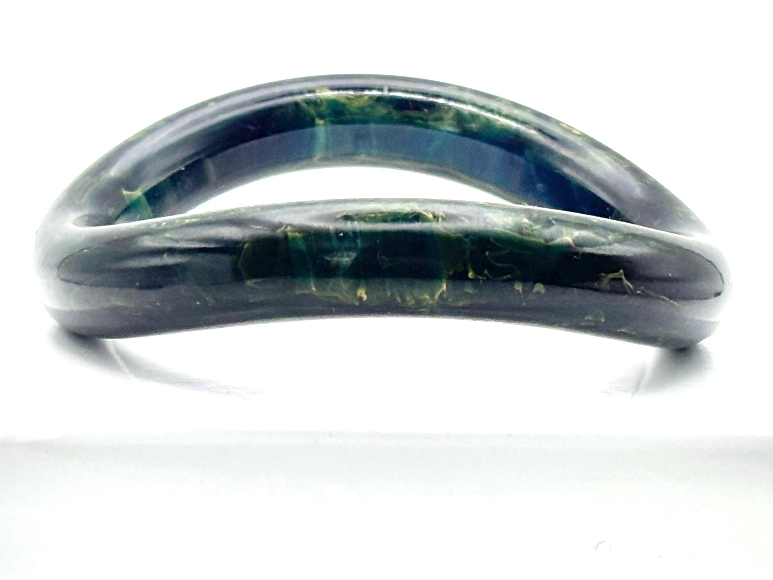 This genuine Bakelite tested bracelet has a twisted pretzel shape and in beautiful End-of-the-Day Blue Moon colors.