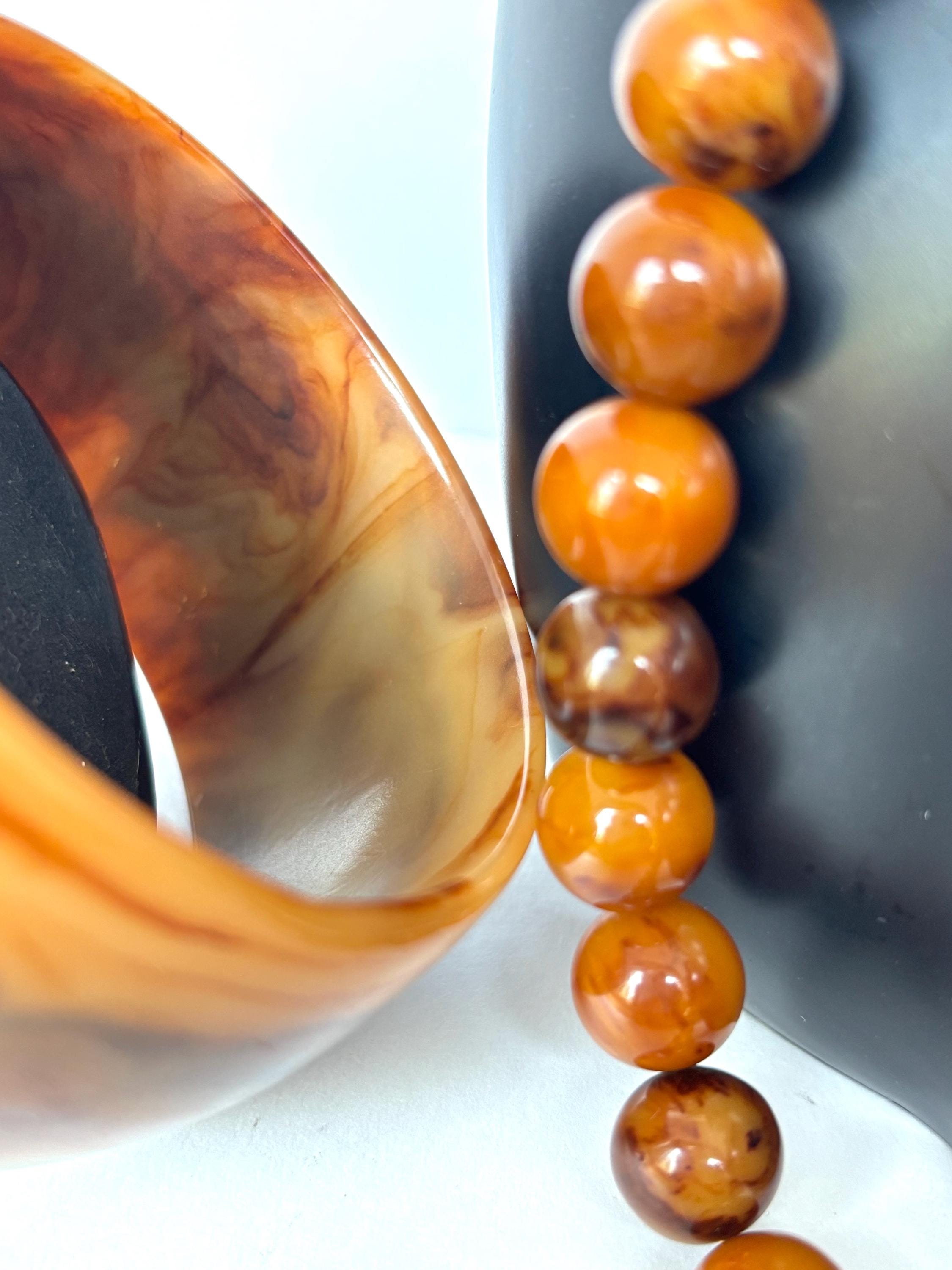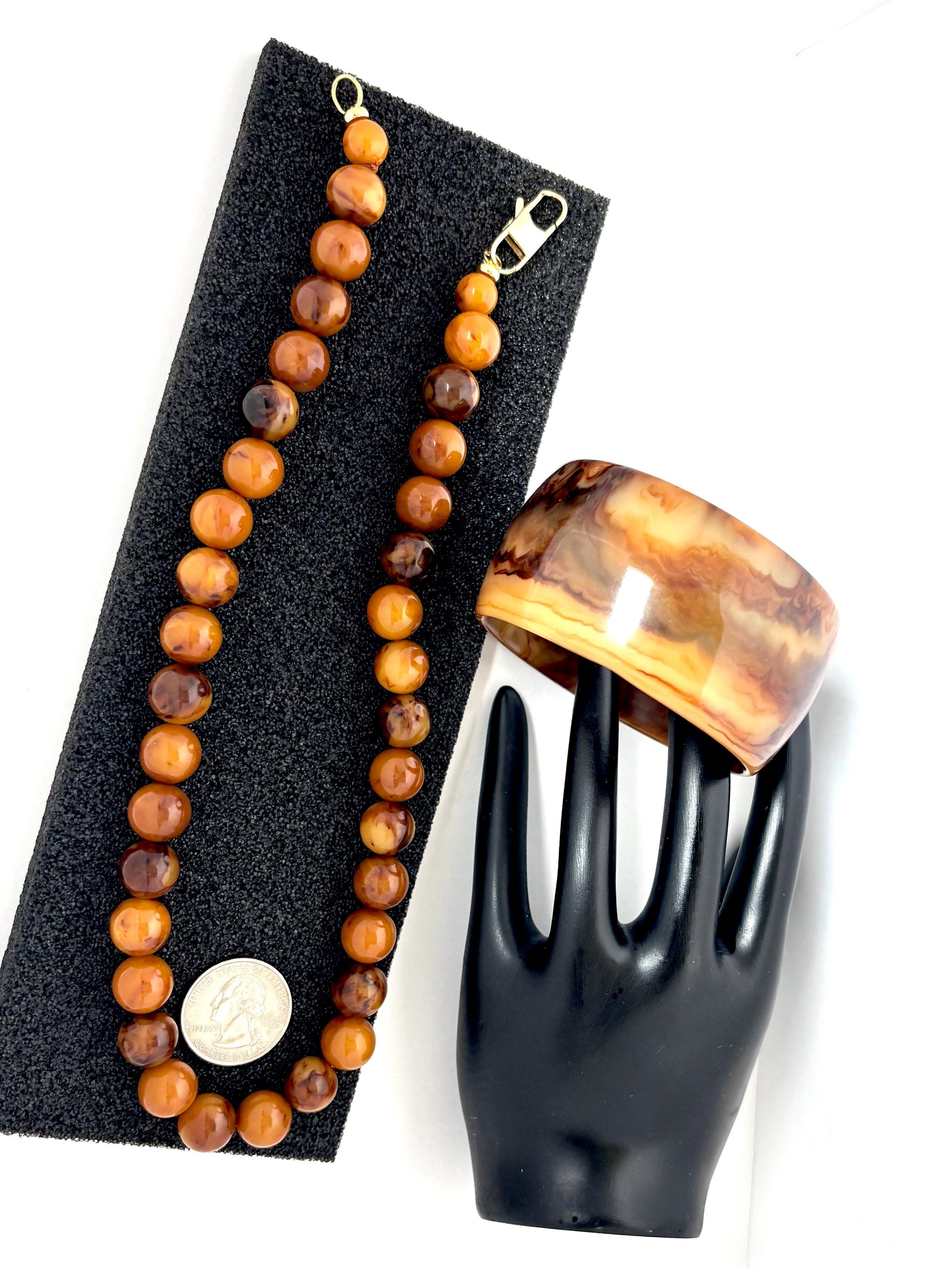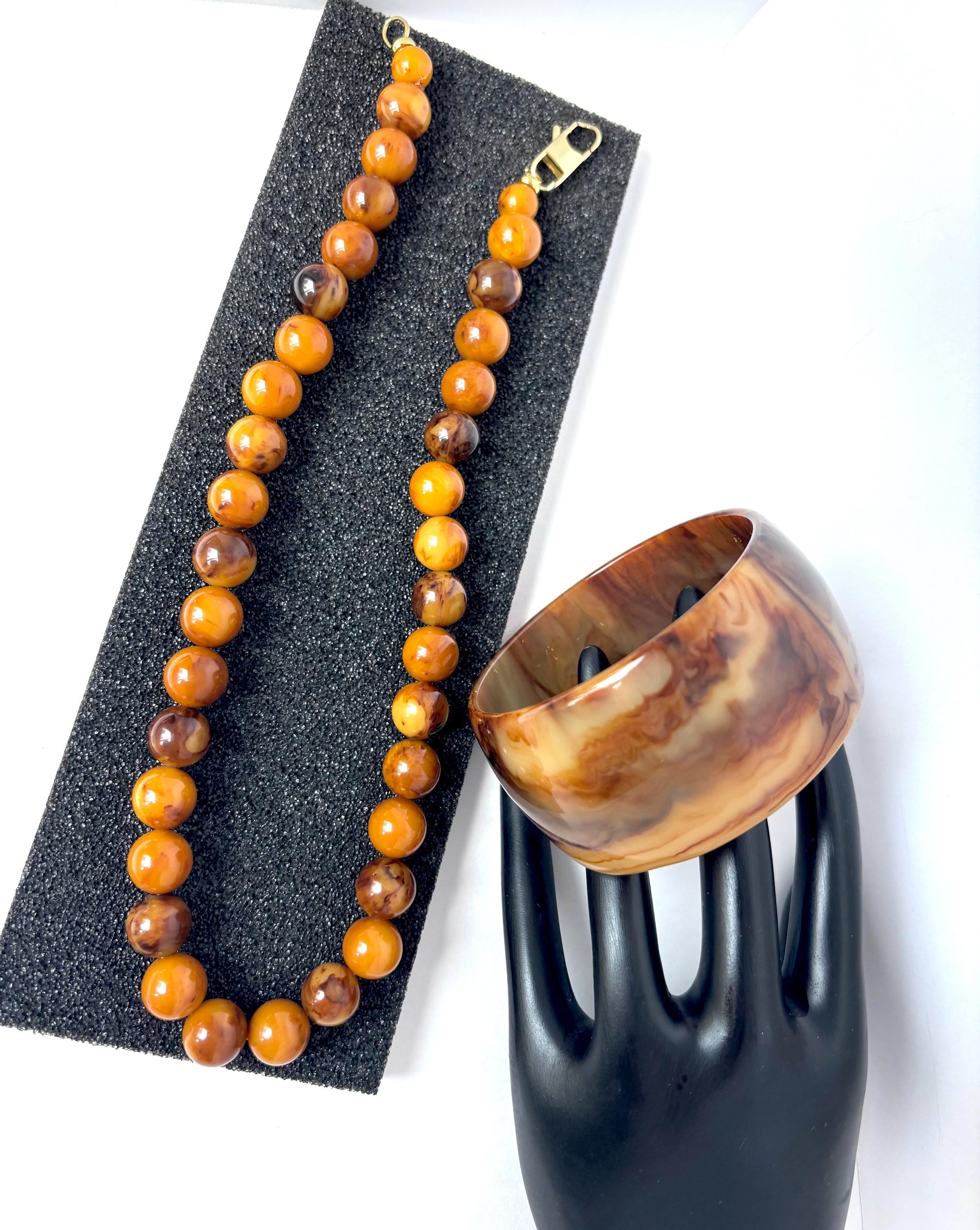 The Bakelite bracelet may be the star of the show with its spatters of varied Earthtone colors of brown & butterscotch on a custard foundation.