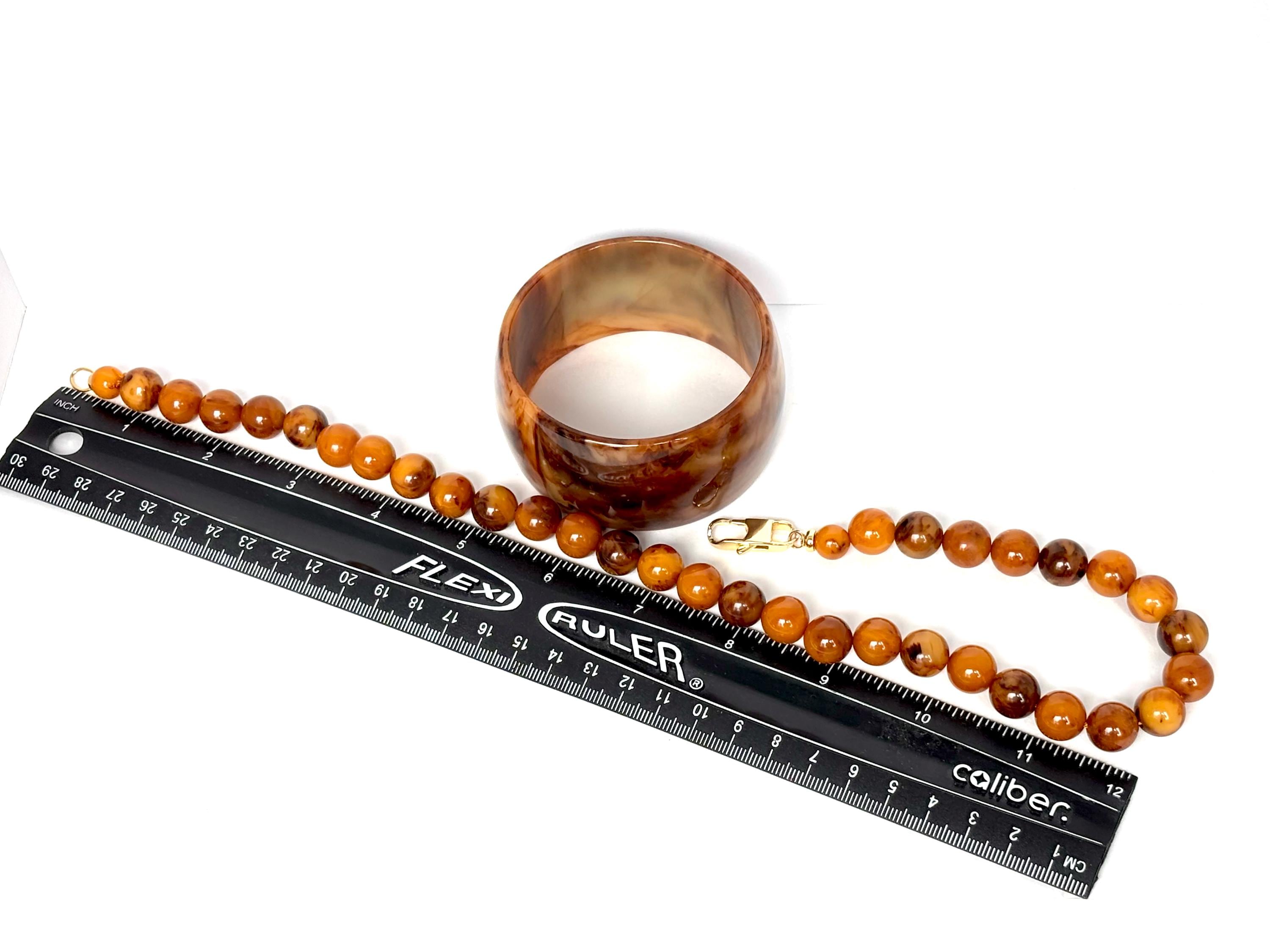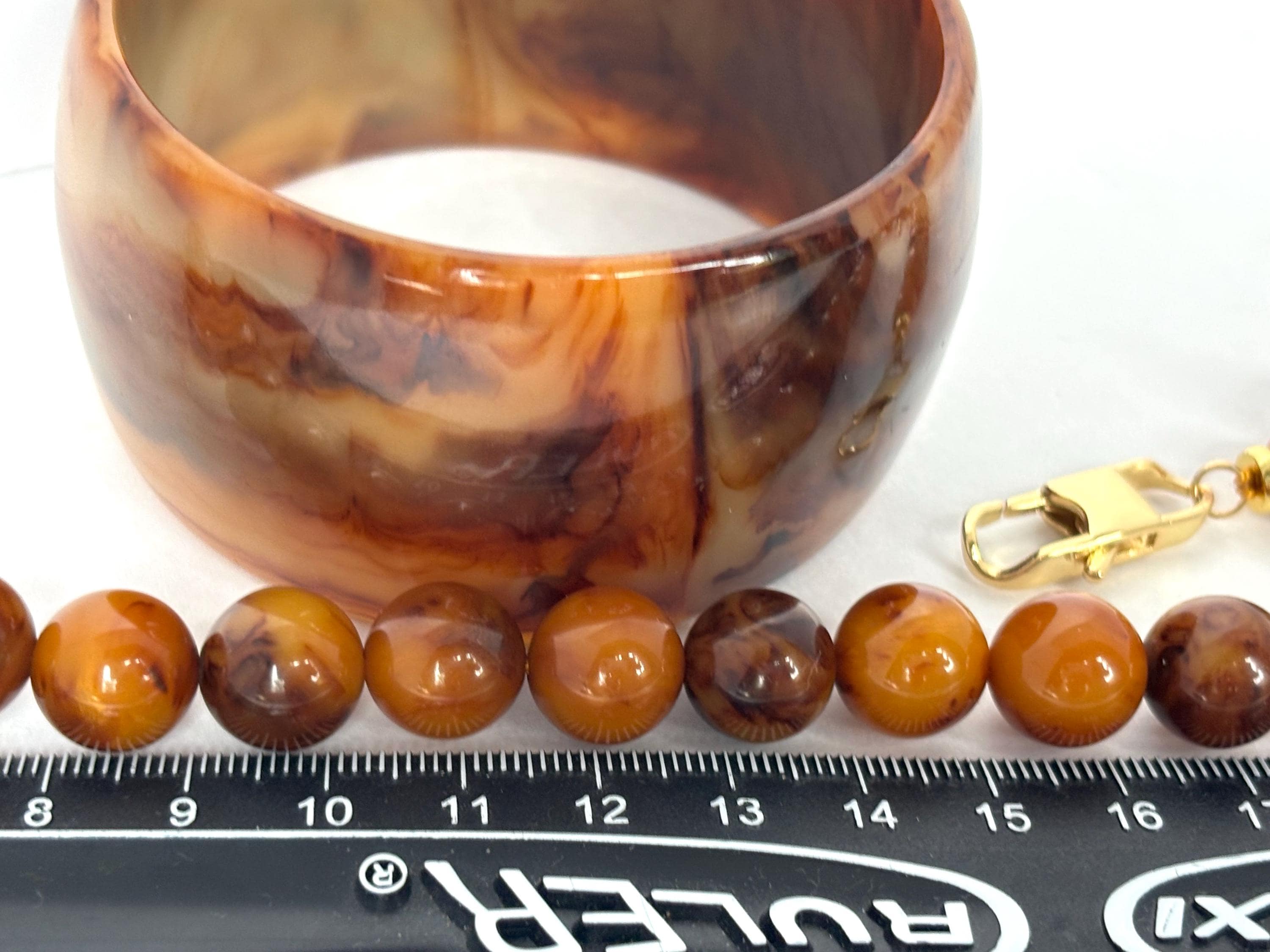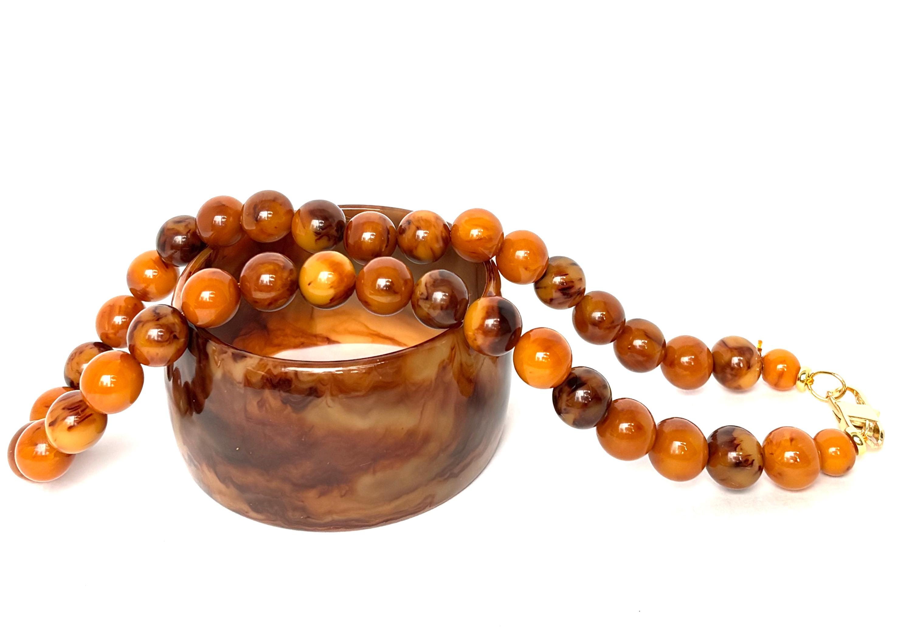 The Bakelite bracelet may be the star of the show with its spatters of varied Earthtone colors of brown & butterscotch on a custard foundation.