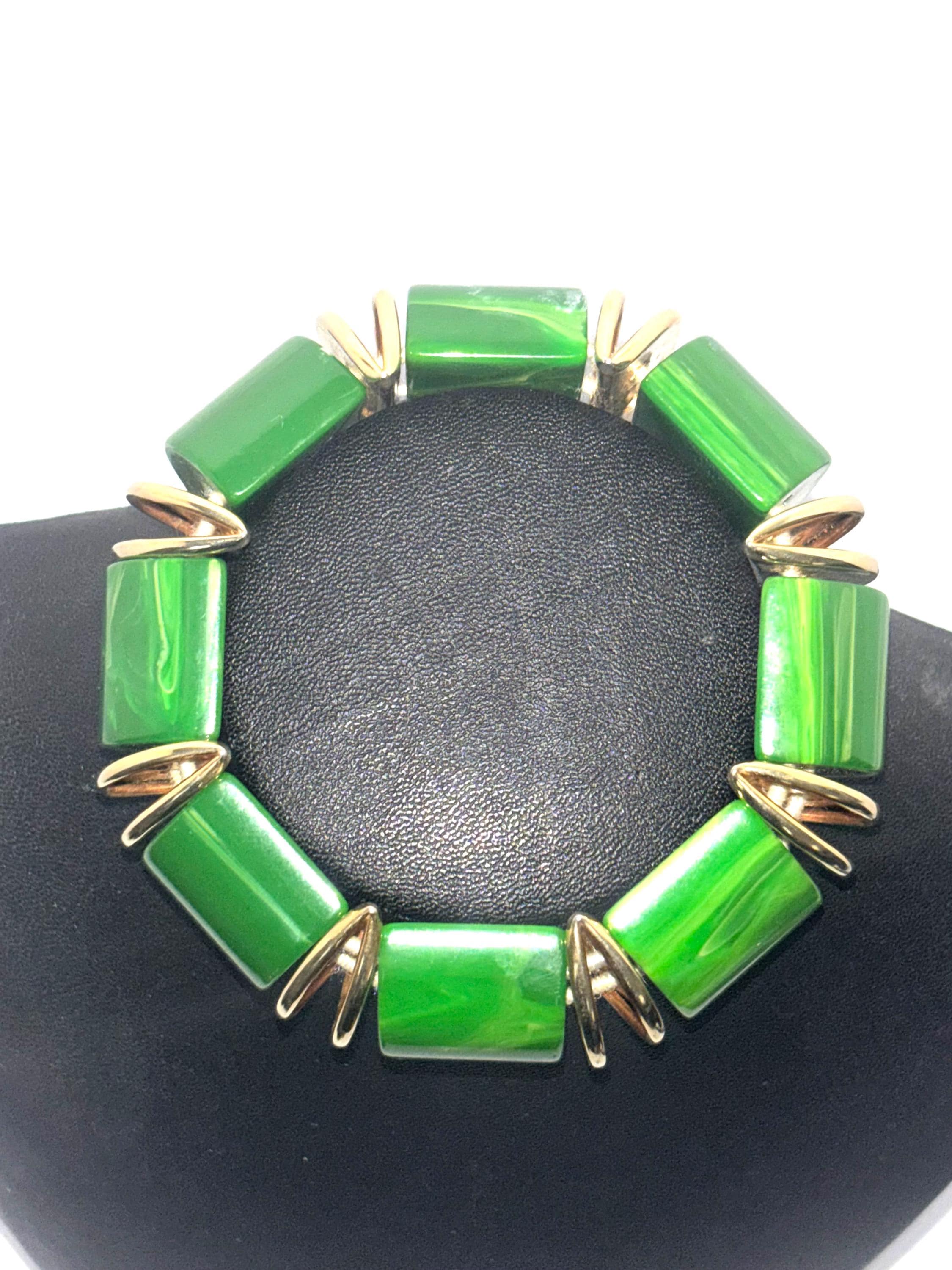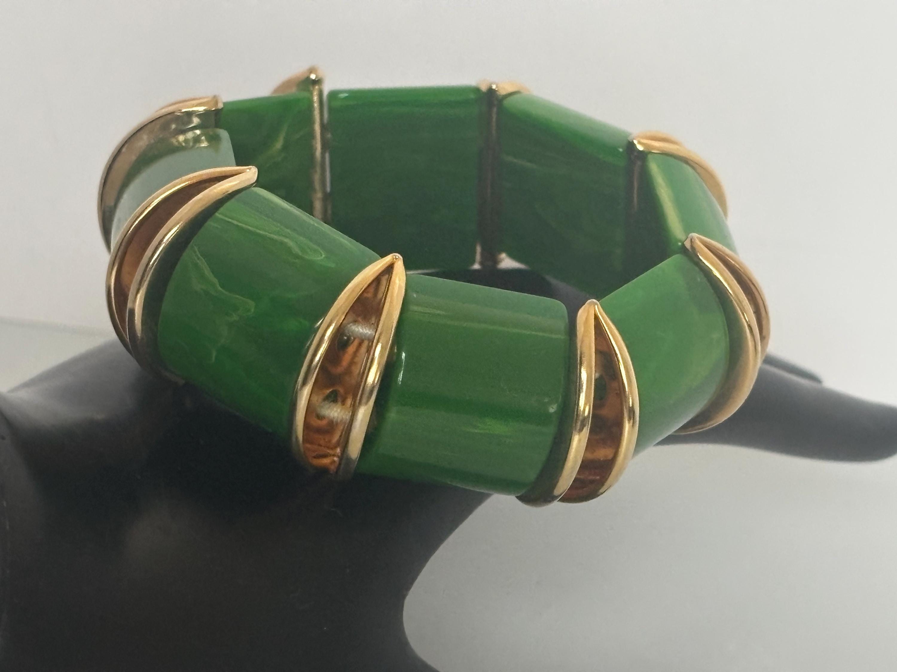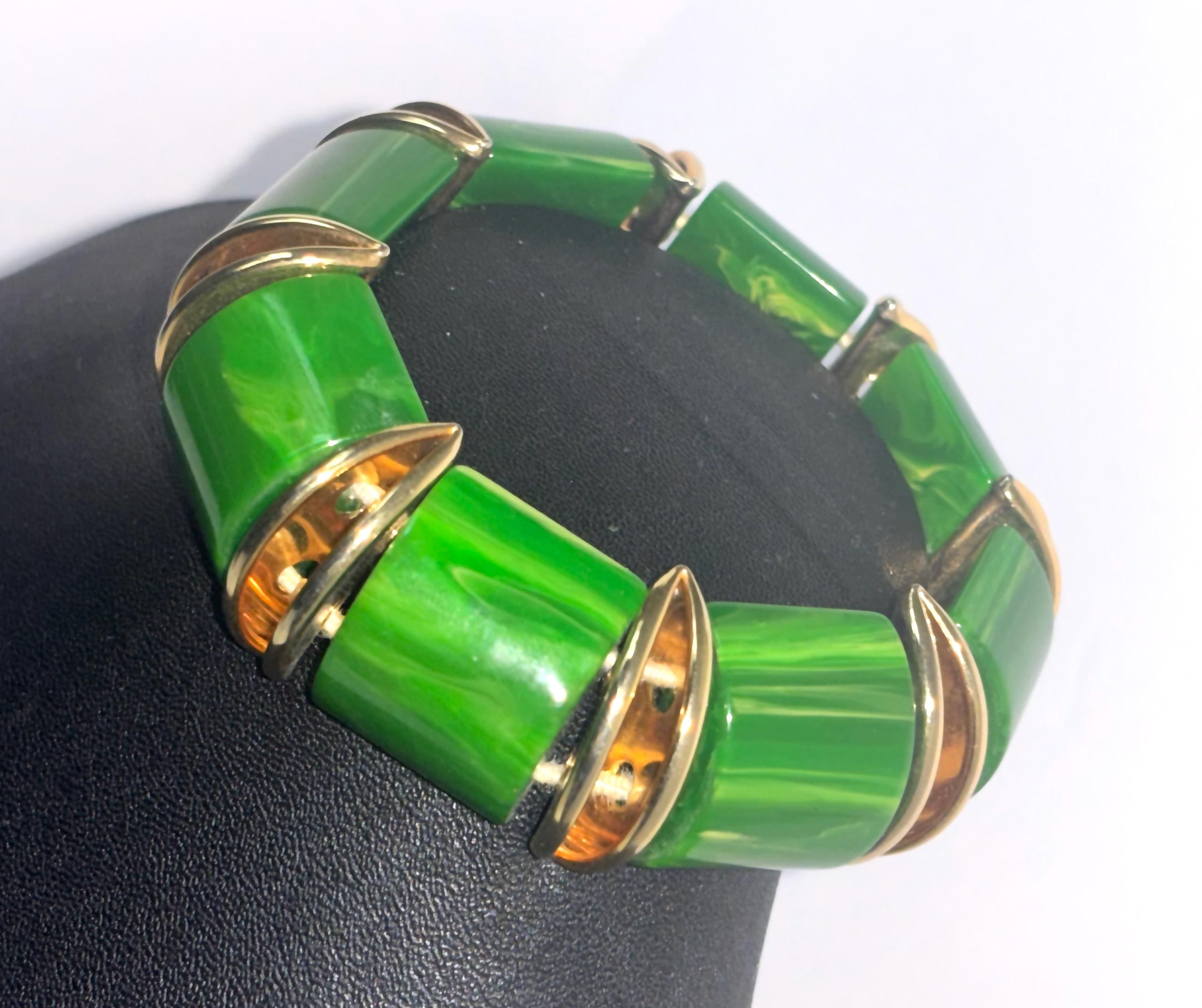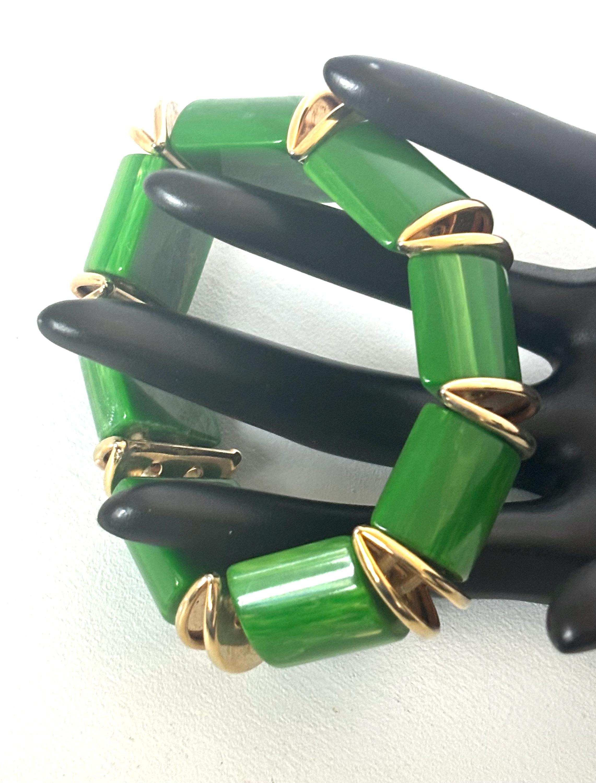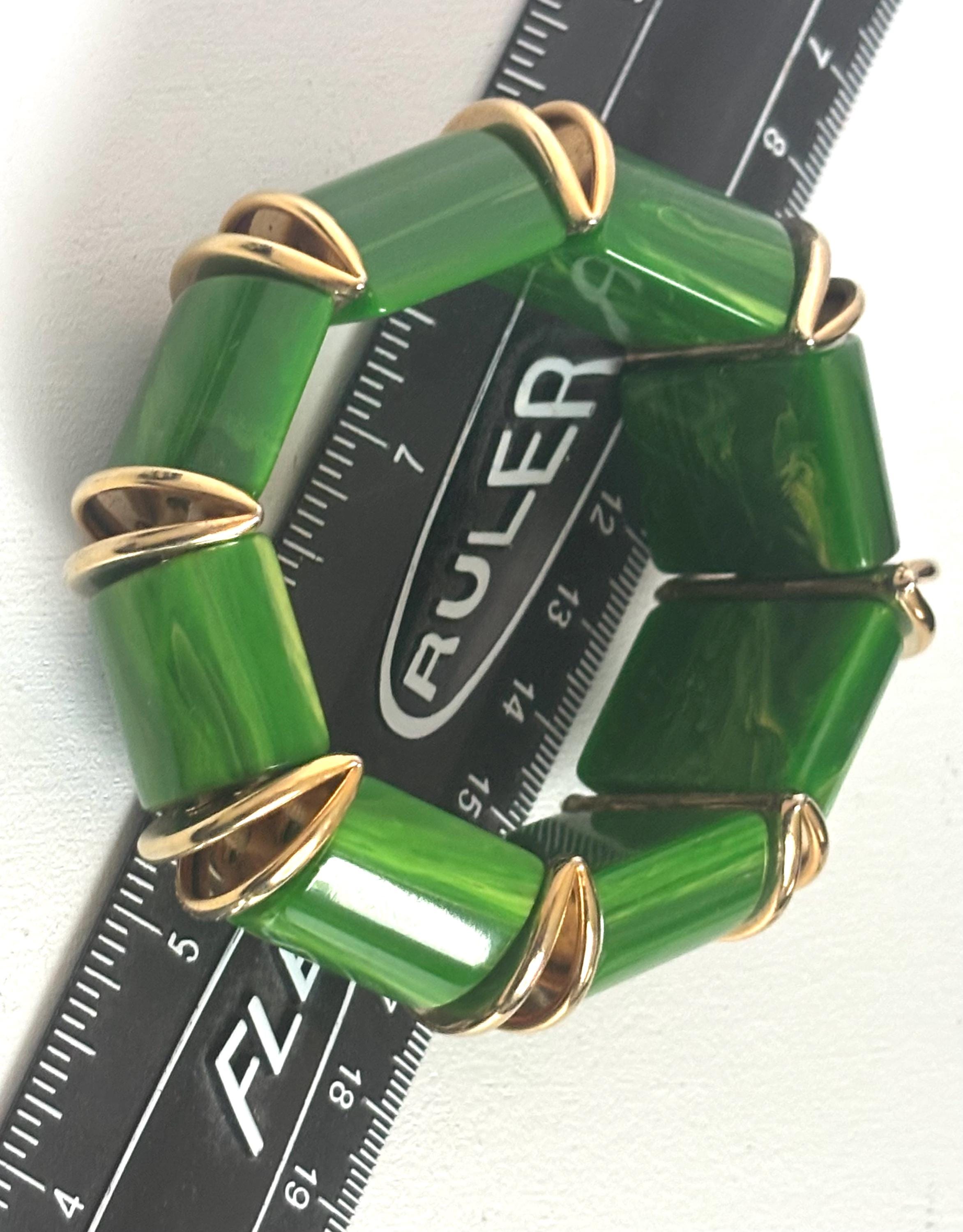 Fun, easy breezy vintage costume jewelry in brilliant green that will accommodate most wrist sizes.
