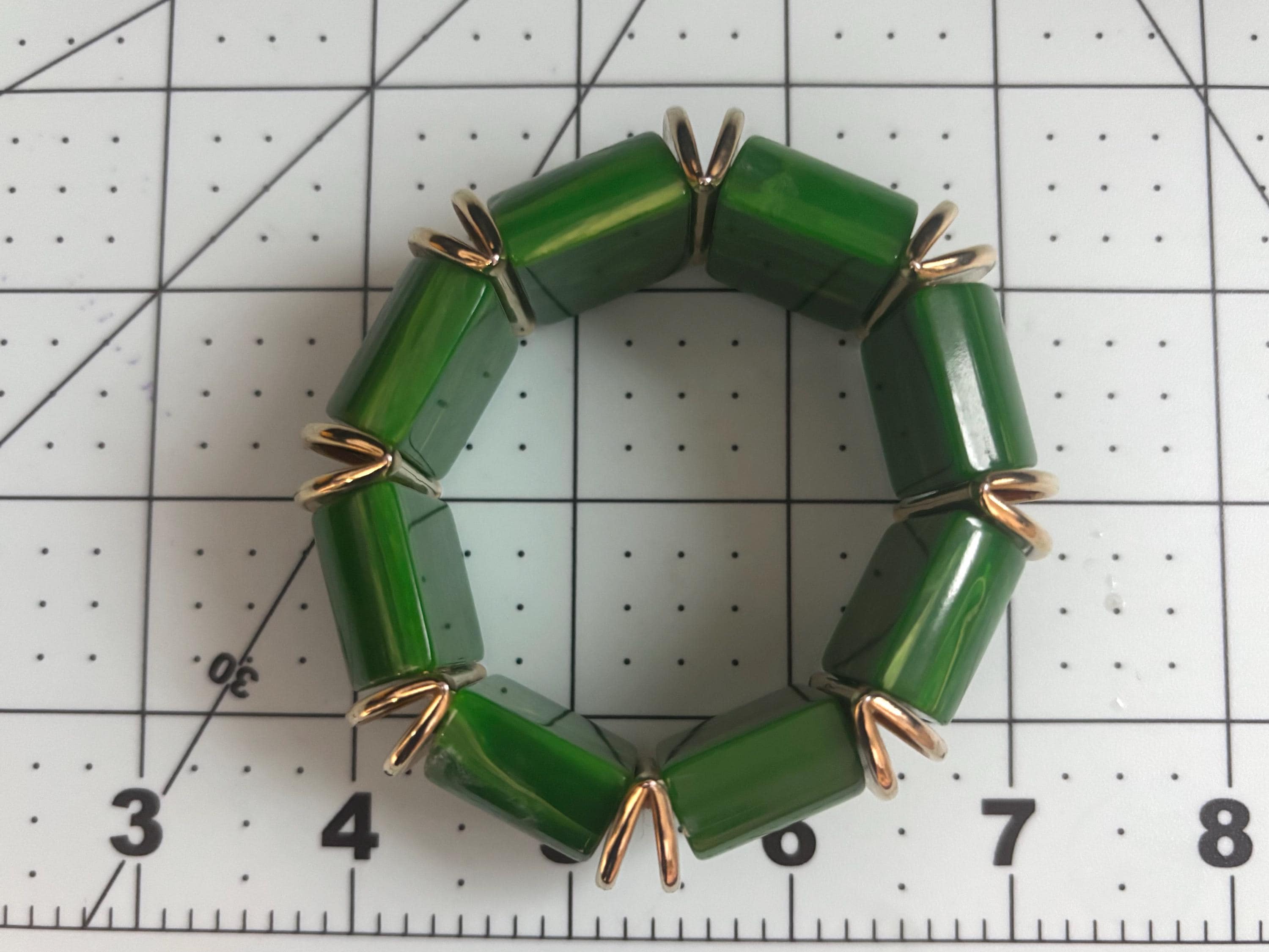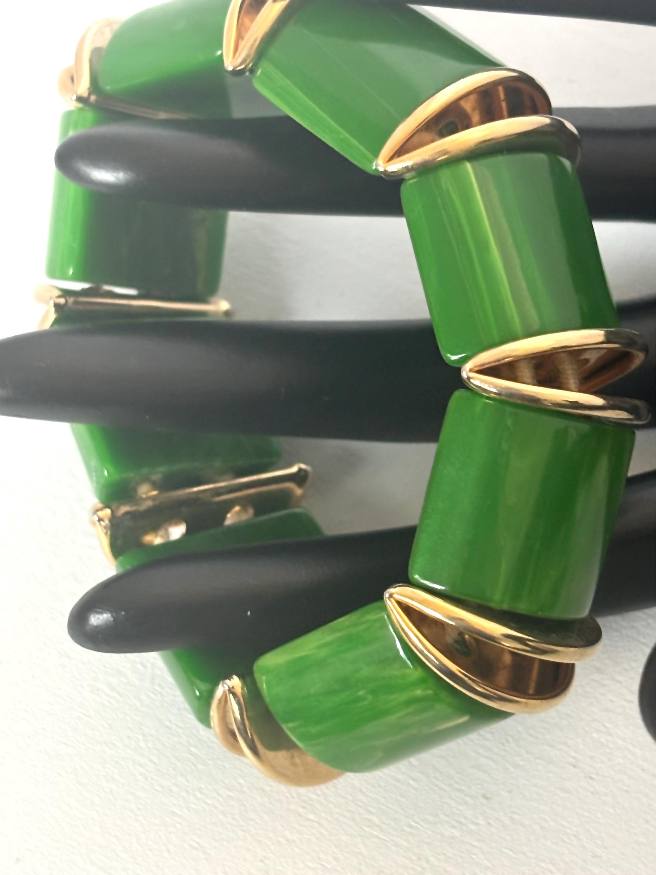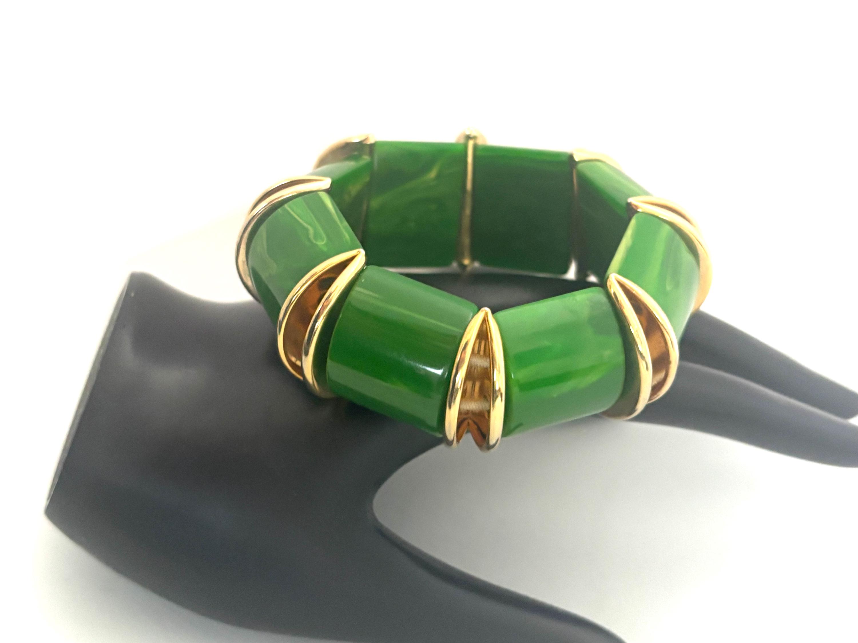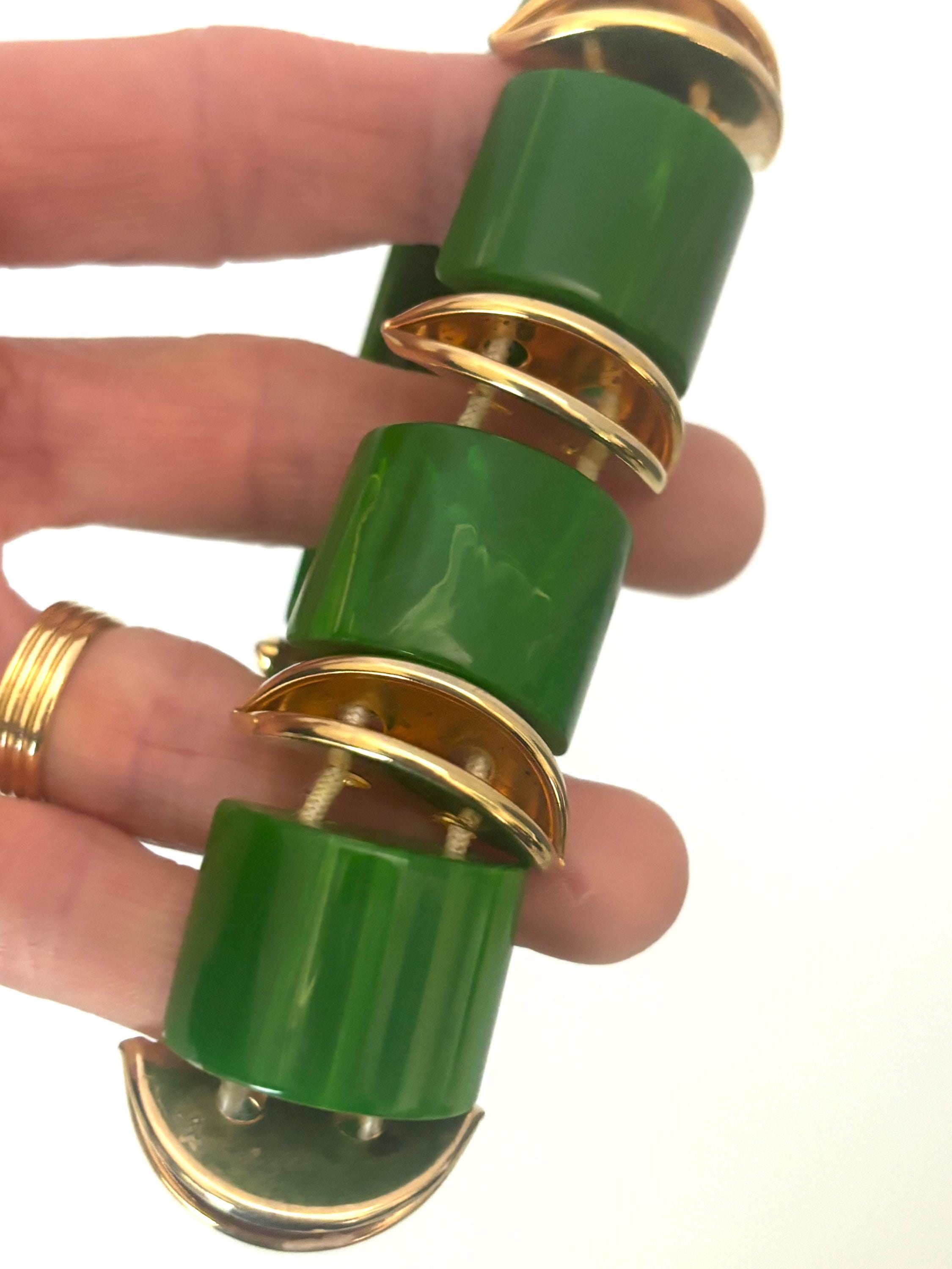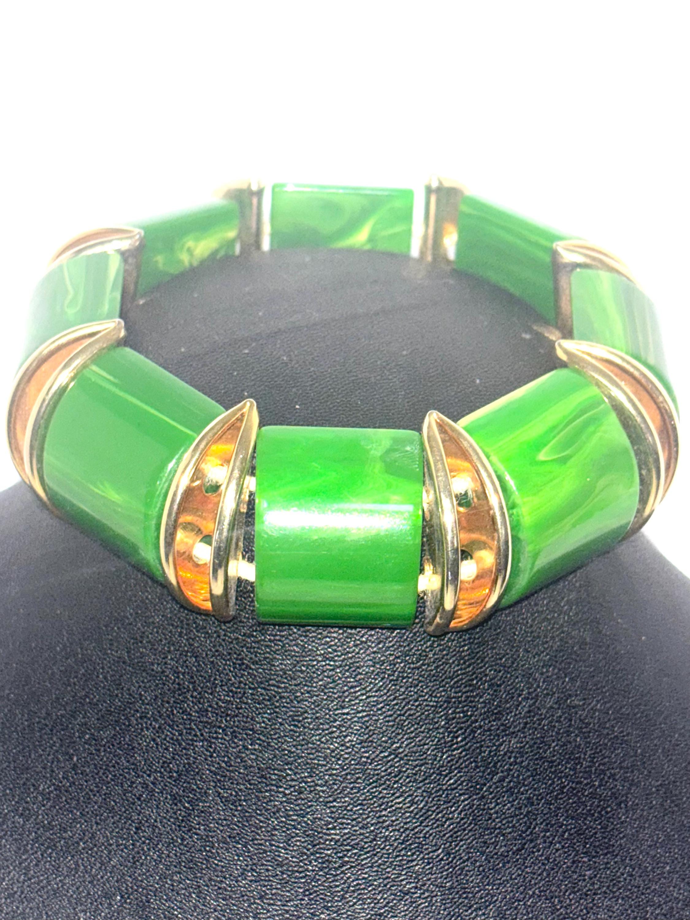 Fun, easy breezy vintage costume jewelry in brilliant green that will accommodate most wrist sizes.