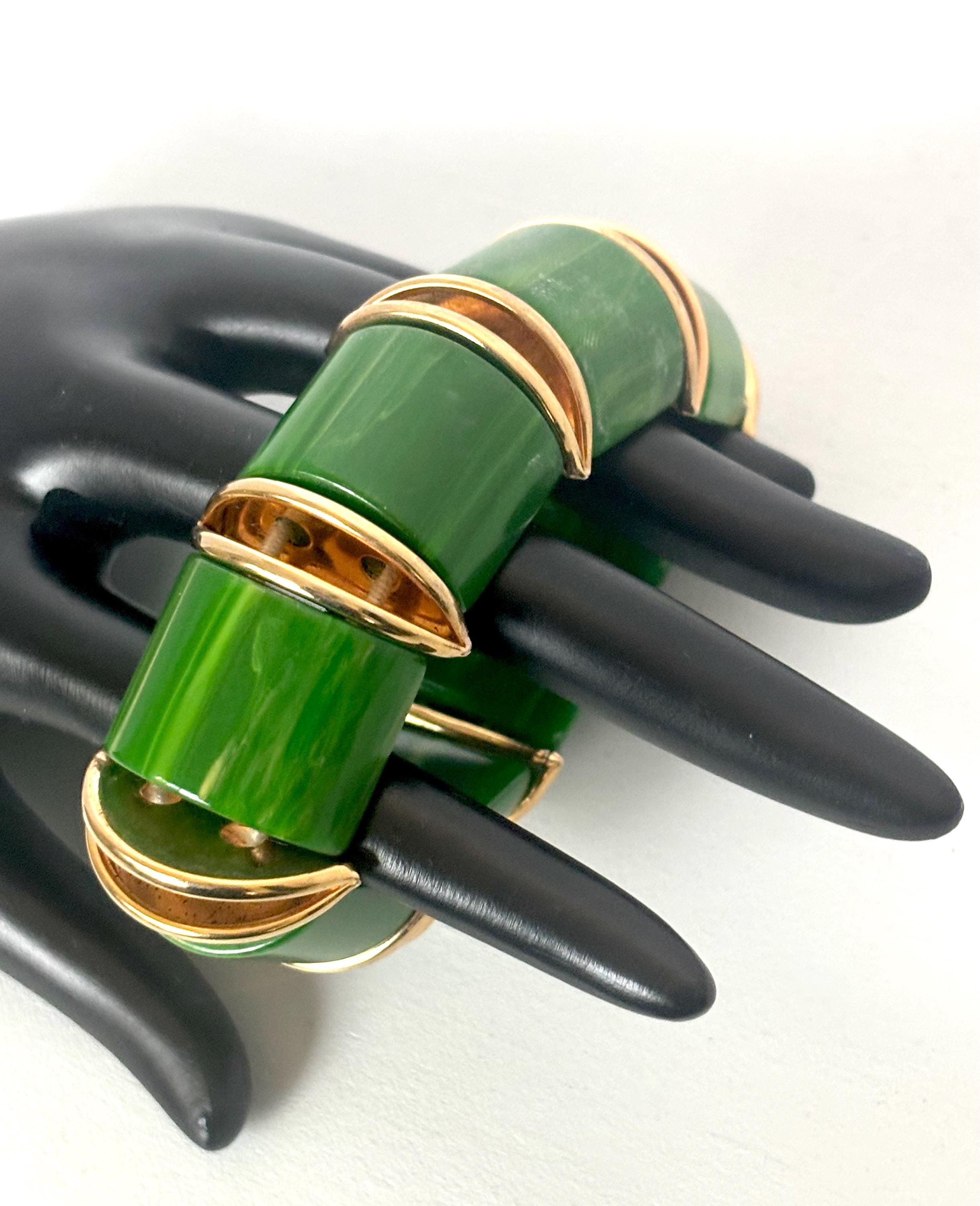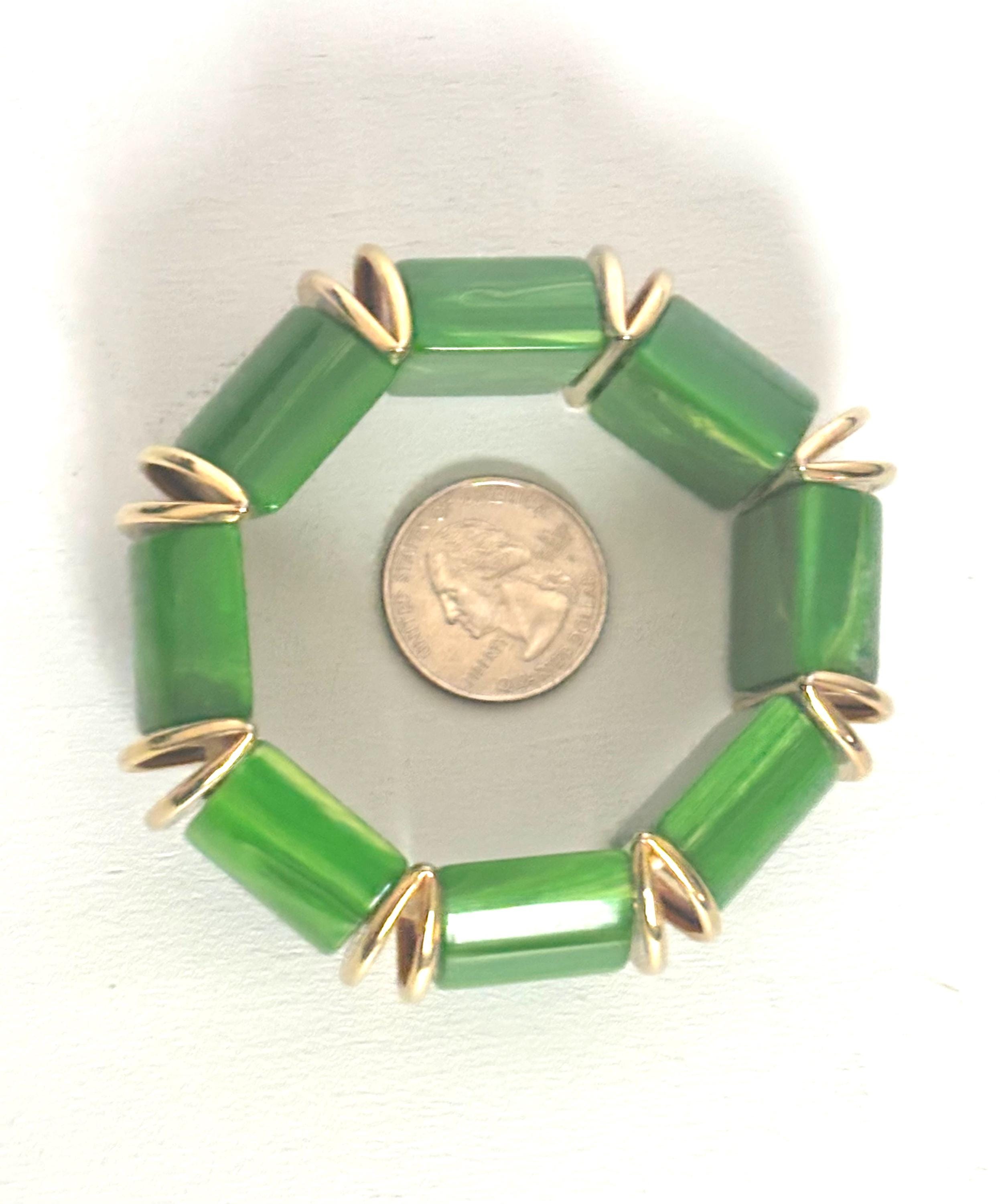 Pretty genuine Bakelite eight-panel bracelet is chunky & brightly saturated in Kelly Green & yellow marbled (End-of-the-Day) color.