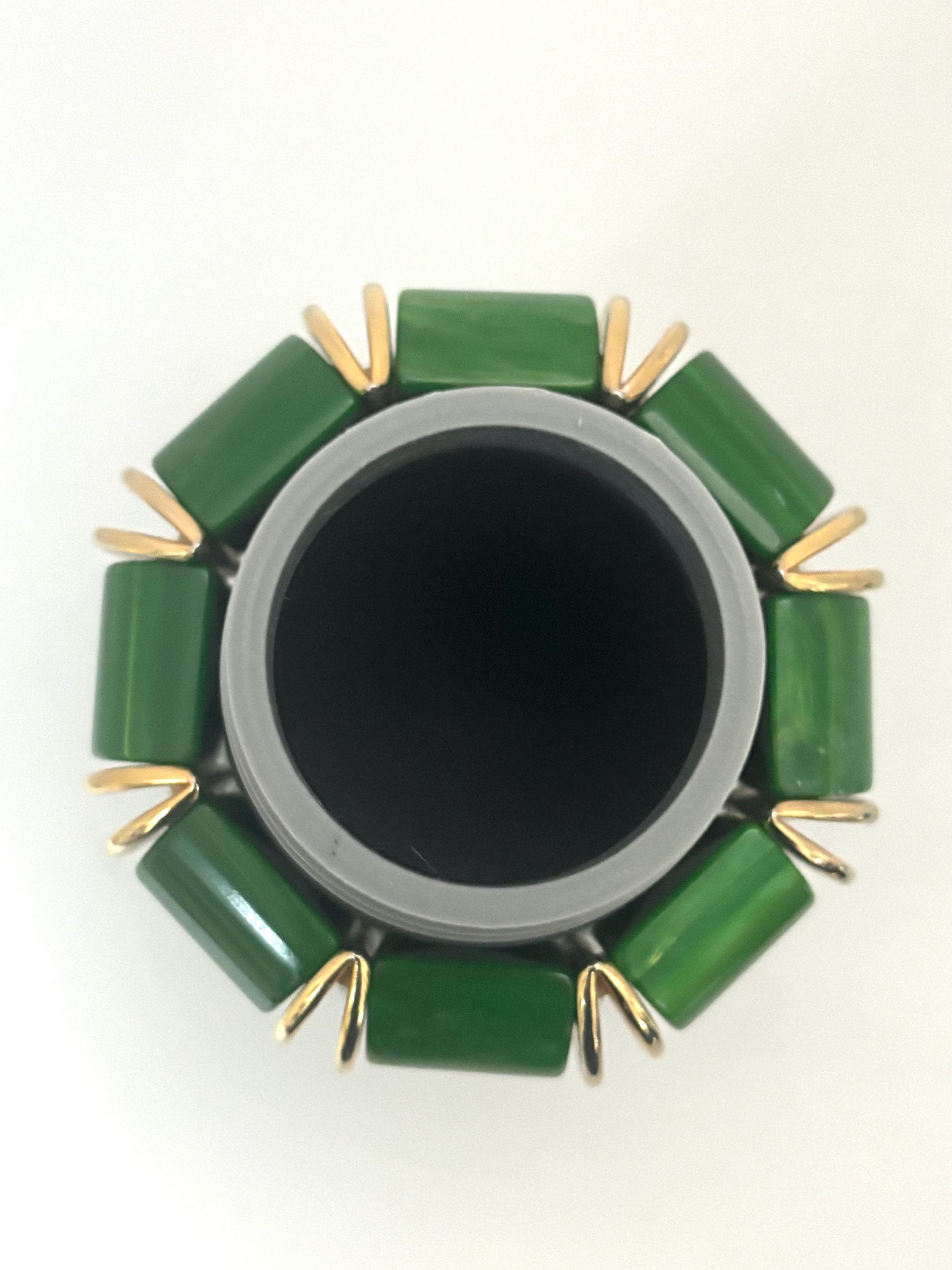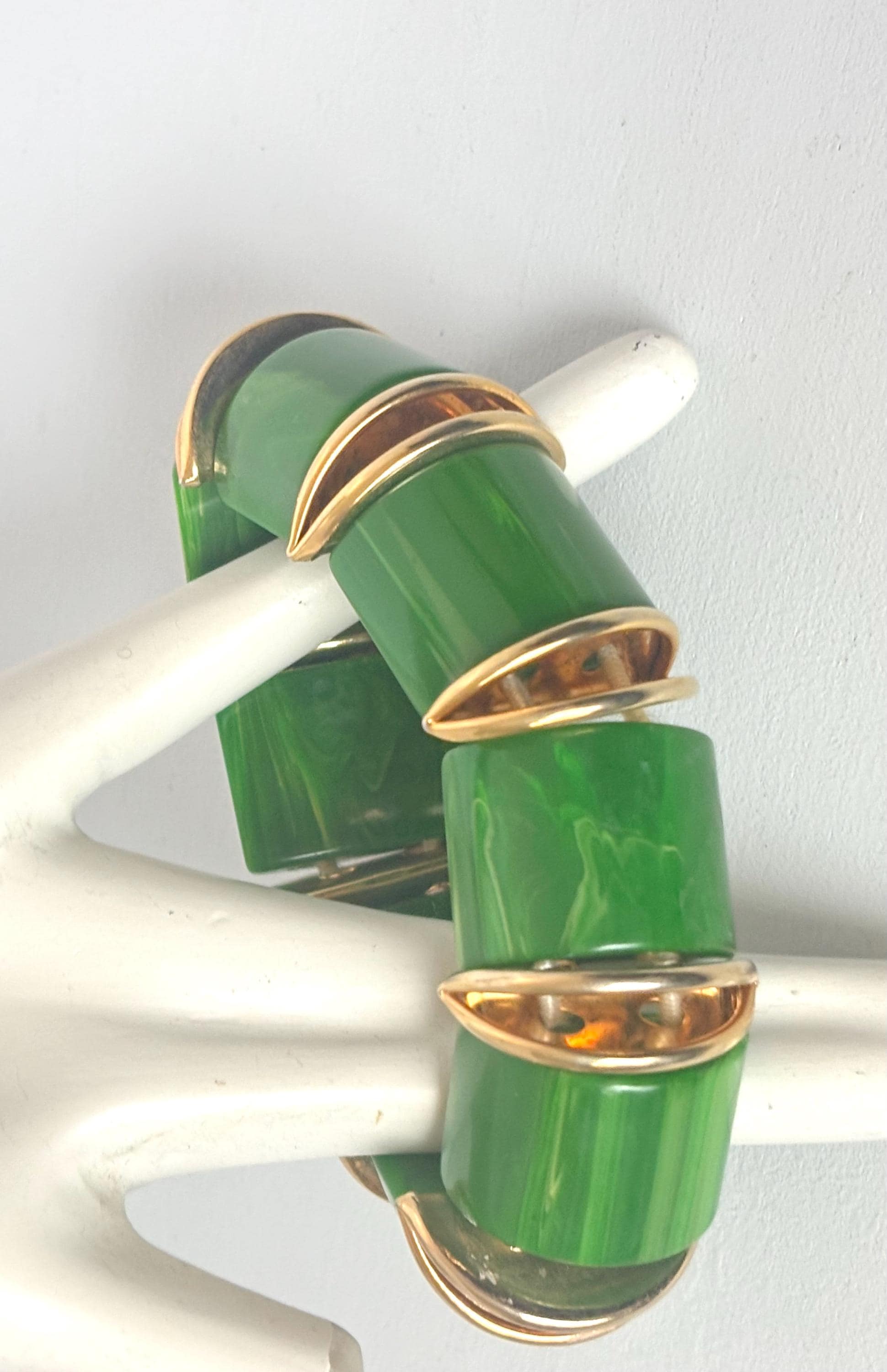 Between each piece of Bakelite is a pretty "open-mouth" spacer created from high-polished, gold-tone metal.