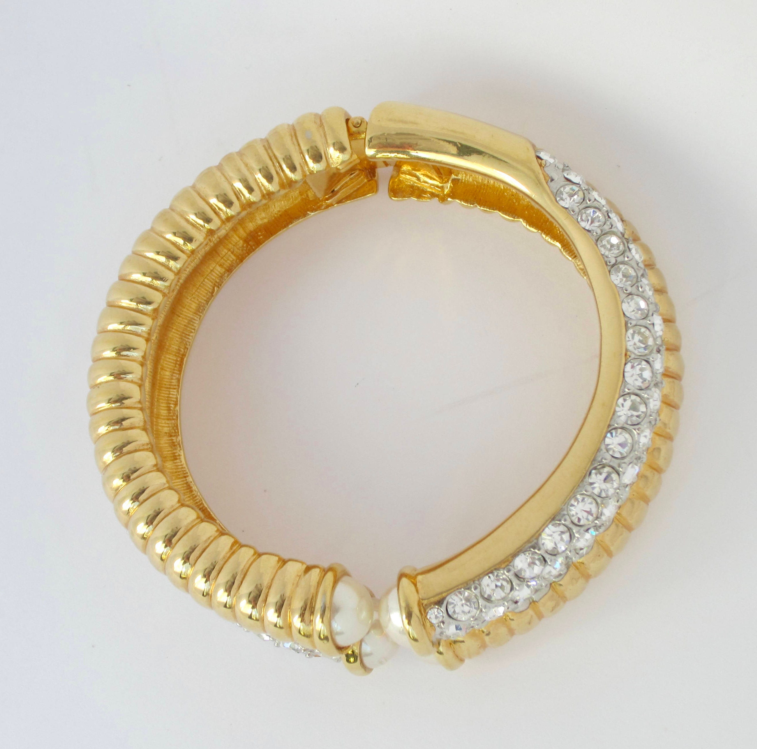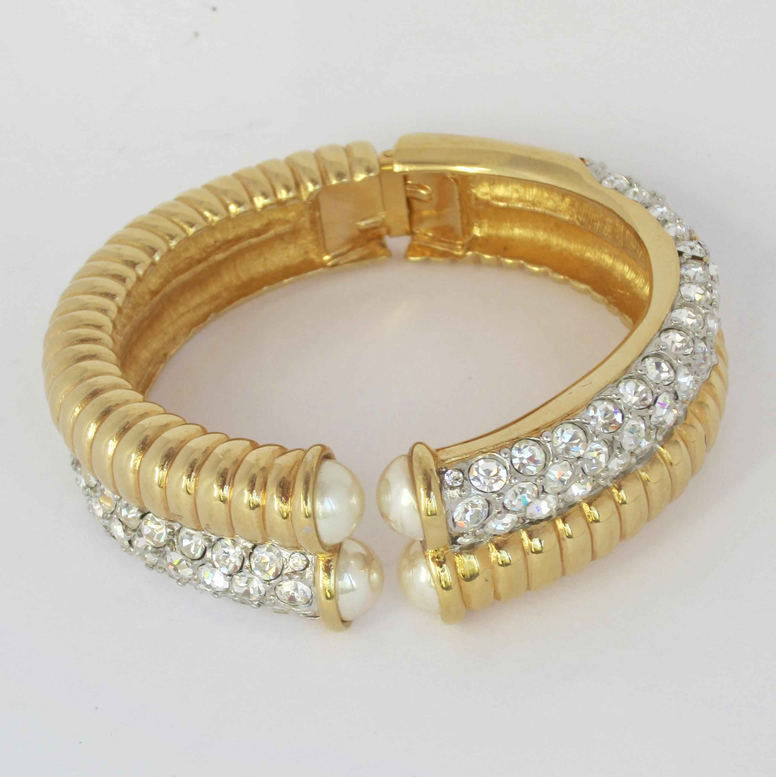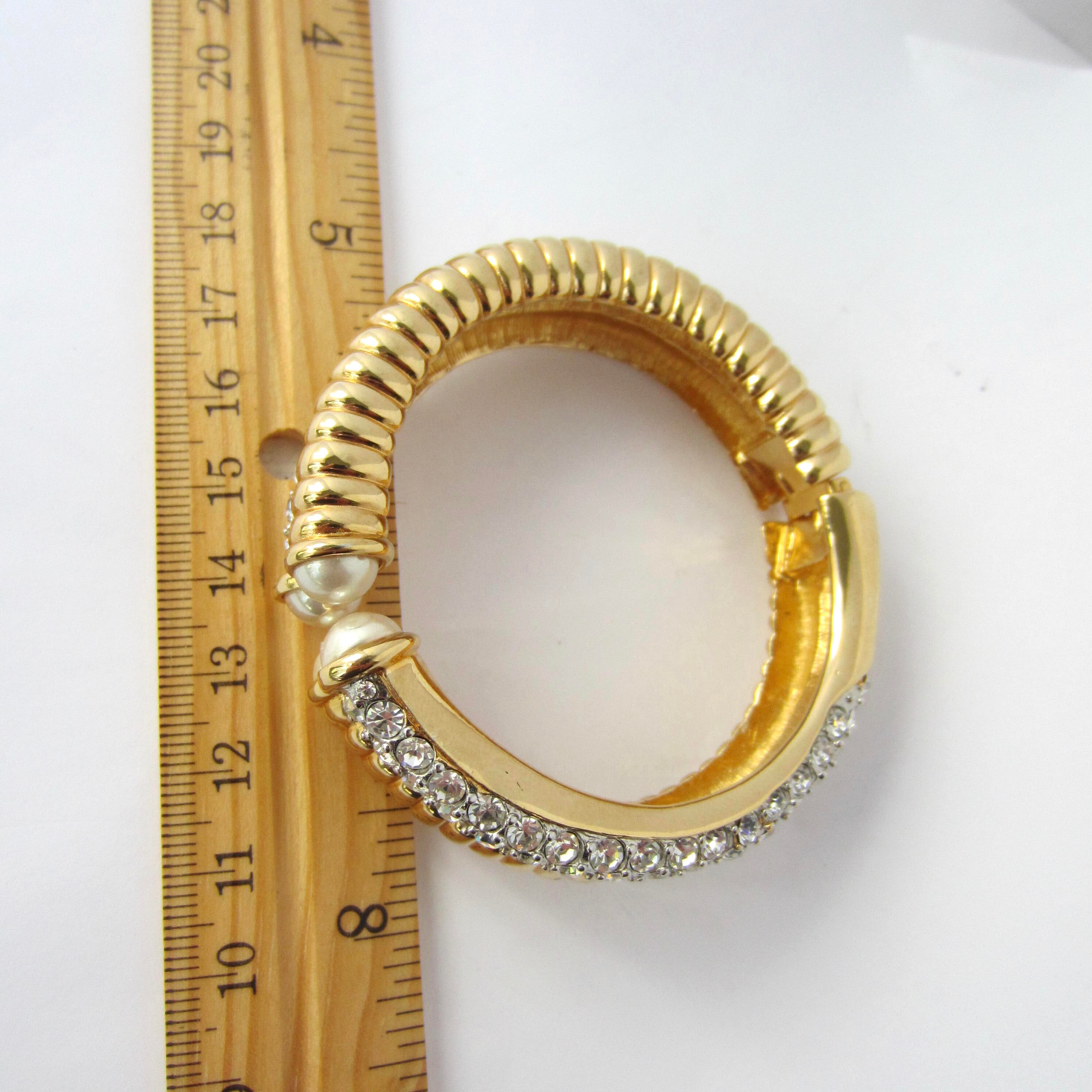 The clamper’s opening has four ~14mm round, creamy white PEARL beads, two on each side, bezel set into the gold tone metal.